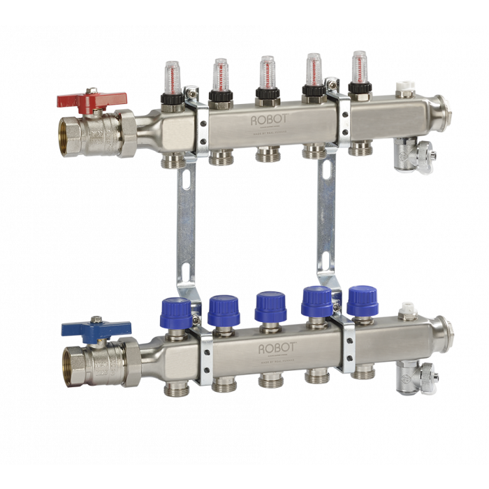 Om dat te regelen kunnen op de aanvoerbalk van een verdeler flowmeters (ook wel debietmeters worden genoemd) worden gemonteerd. Daarmee is het mogelijk om de hoeveelheid water per groep in te stellen. Het vermogen per groep is afhankelijk van de hoeveelheid warm water wat er door die groep circuleert. Het op de juiste manier inregelen van de volumestroom per groep is niet alleen bepalend voor het comfort maar ook bepalend voor het juiste verschil in temperatuur van het water wat de groep in gaat (de aanvoertempratuur) en de tempratuur van het water wat de groep verlaat (de retourtemperatuur). Deze waarden zijn weer van belang voor het juist functioneren van de warmtebron.